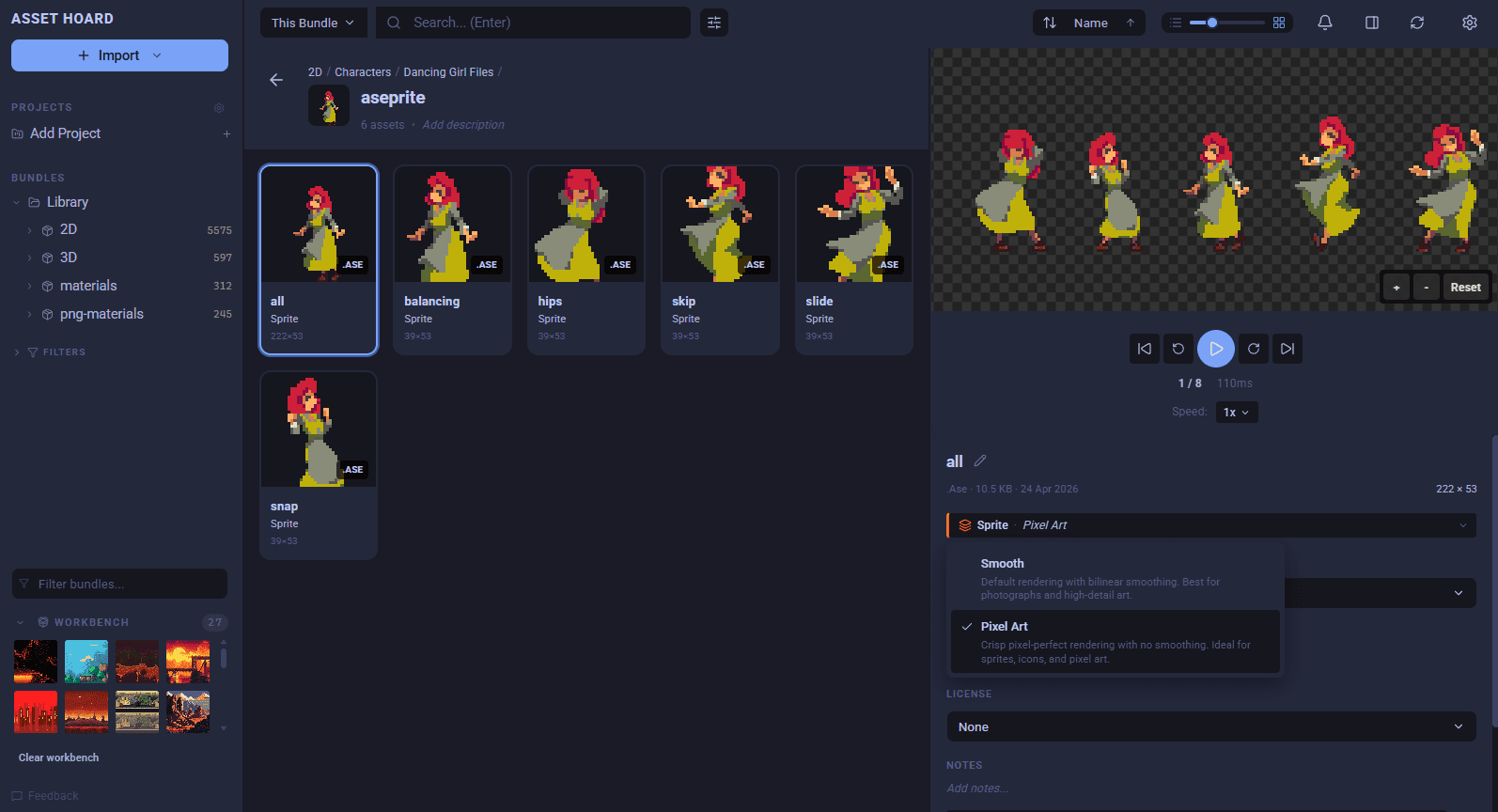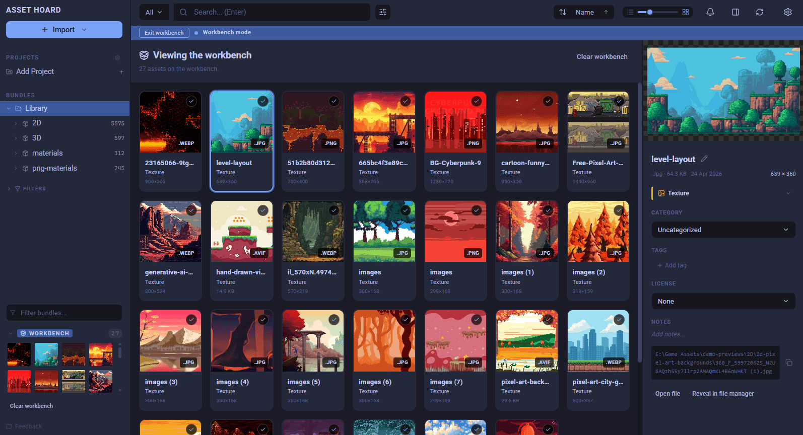 Asset Hoard now recognises pixel art on import automatically and keeps those tiny sprites crisp instead of blurry. It works across PNG, GIF, TGA, Photoshop, Krita, and more.